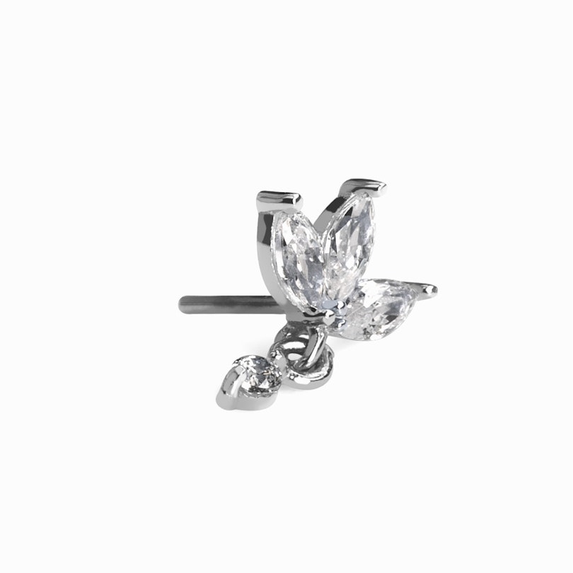 Deze prachtige 14k gouden push-in bovenkant heeft een trio marquise snit met tandjes gezette CZ stenen in de vorm van een lotusbloem, met een ronde met tandjes gezette steen als bedeltje die aan de bloem hangt.