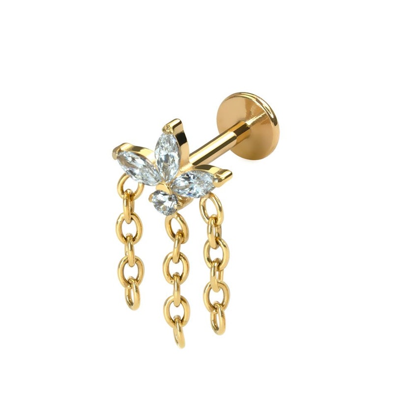 Deze ongewone labret heeft 4 CZ stenen; 3 hebben een marquise snit en staan rondom een kleiner rond steentje, waardoor het sieraad de vorm van een bloem heeft. Alle onderste drie stenen hebben een elegant kettinkje eraan hangen. Het sieraad is push-in, wat betekent dat het makkelijk aan te brengen is in je piercing: druk simpelweg het topje in het staafje. Gemaakt van titanium, is het geschikt voor gevoelige huid. De maat van het sieraad maakt het geschikt voor verschillende oor piercings, waaronder flat, tragus, en stacked lobe piercings.