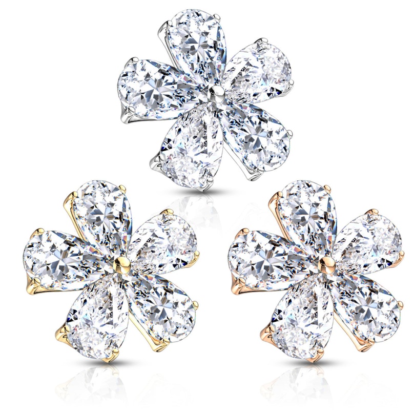 Dit sieraad hier is een dermal in de vorm van een bloem en heeft vij mooie druppelvormige steentjes, die de blaadjes van de bloem voorstellen. De bloem is gemaakt van messing en aanvolgend bedekt met een coating om het zo de mooie kleur te geven. Je hebt overigens keuze tussen verschillende kleuren, namelijk goud, roodgoud en blank glanzend. Het sieraad is niet volledig gemaakt van messing. Aan de onderkant zit een klein schroefje dat gemaakt is van chirurgisch staal - het zou natuurlijk ook erg moeilijk zijn om dit sieraad te gebruiken als het alleen maar een vlak plaatje in de vorm van een bloem zou zijn.
