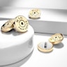 Het deel van het sieraad dat in de dermal anchor base gaat en in contact staat met de huid, is gemaakt van chirurgisch staal. Het patroon is gemaakt van messing en is bedekt met een goudkleurig deklaagje, waardoor het op een echt patroon lijkt. Het sieraad meet ongeveer 7 mm - daardoor is er dan ook genoeg plek voor de ingegraveerde tekst die je op de afbeelding hierboven kunt zien.