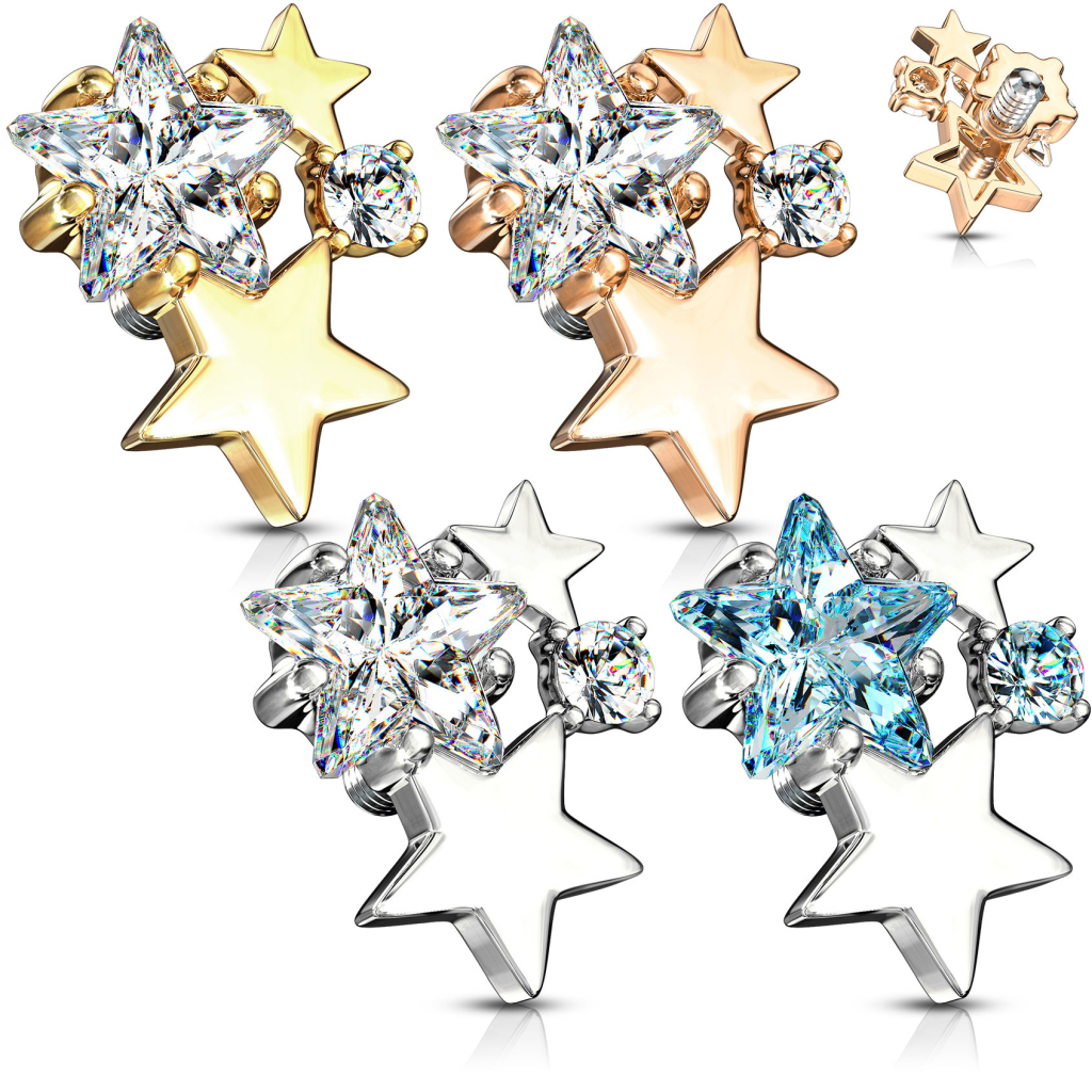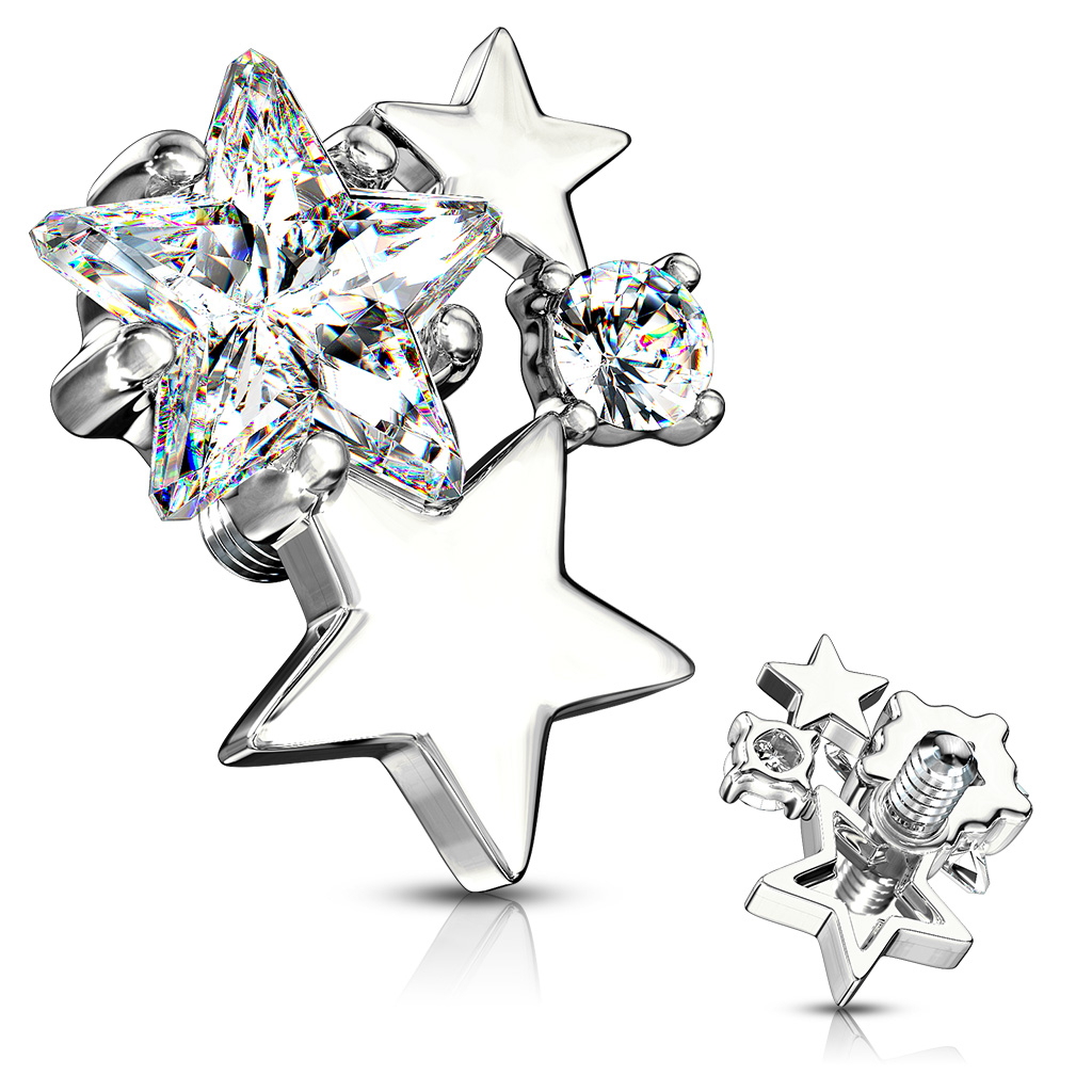 Met dit juweel krijg je niet een enkel sterretje, maar er nog eens drie boven op' Twee glanzend metalen sterren, een ster uit steen, en nog eens een helder klein sterretje aan de zijkant. Er is dus veel bekijks op deze dermal! De sterren zijn gemaakt uit messing en daarna gecoat met een kleur naar keuze. De schroef aan de achterkant is daarentegen uit chirurgisch staal vervaardigd.