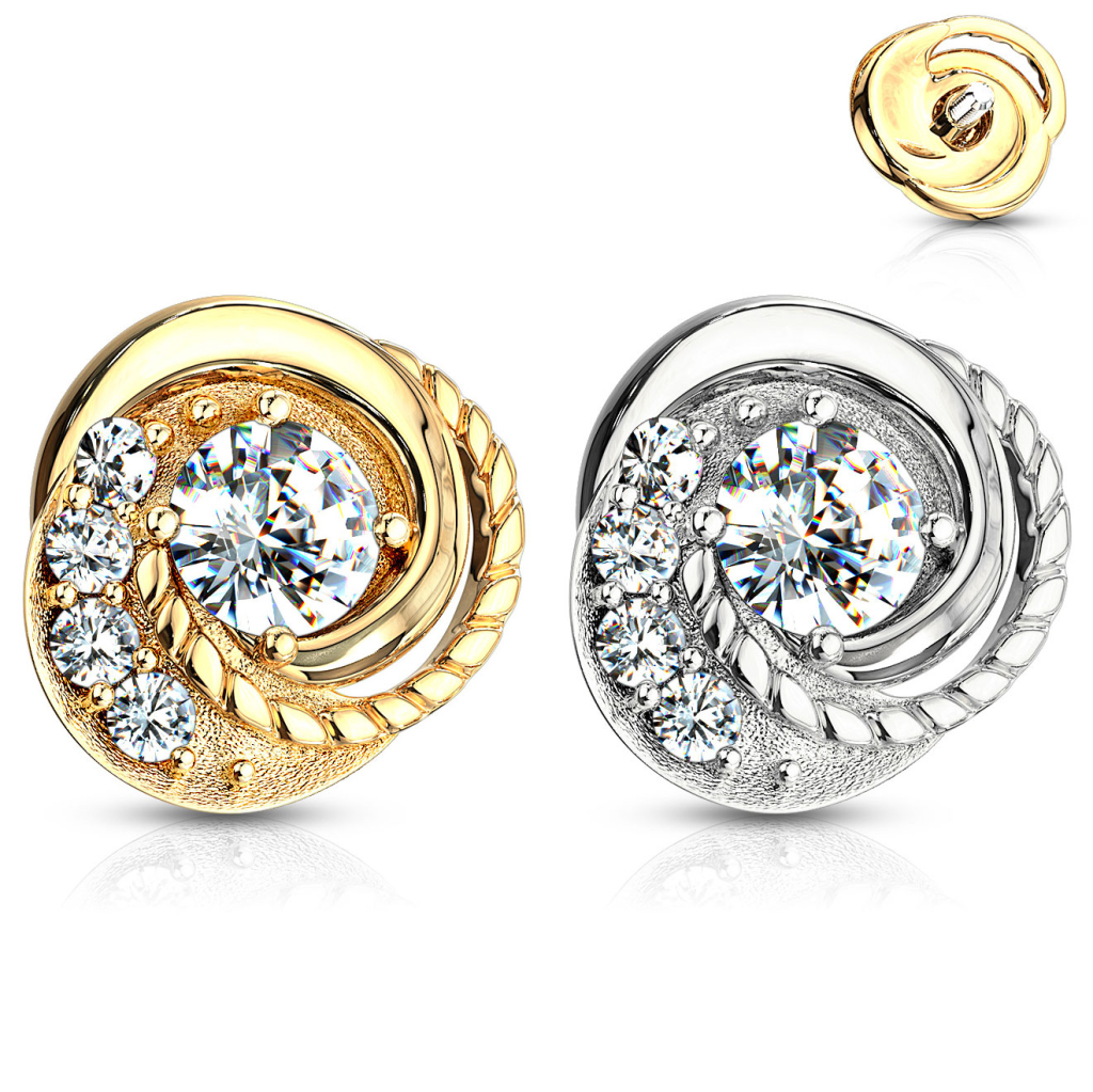 Dit dermal is een erg interessant exemplaar. Door zijn opvallend ontwerp onderscheidt het zich van andere juwelen. De ene zijkant werd met een mooi gevlochten patroon versierd, welke aan de buitenkant begint en in het midden eindigt. De andere kant is dan weer voorzien van een rij transparante steentjes. Om het plaatje helemaal af te maken, werd er in het midden van het sieraad een mooie grote transparante steen geplaatst.