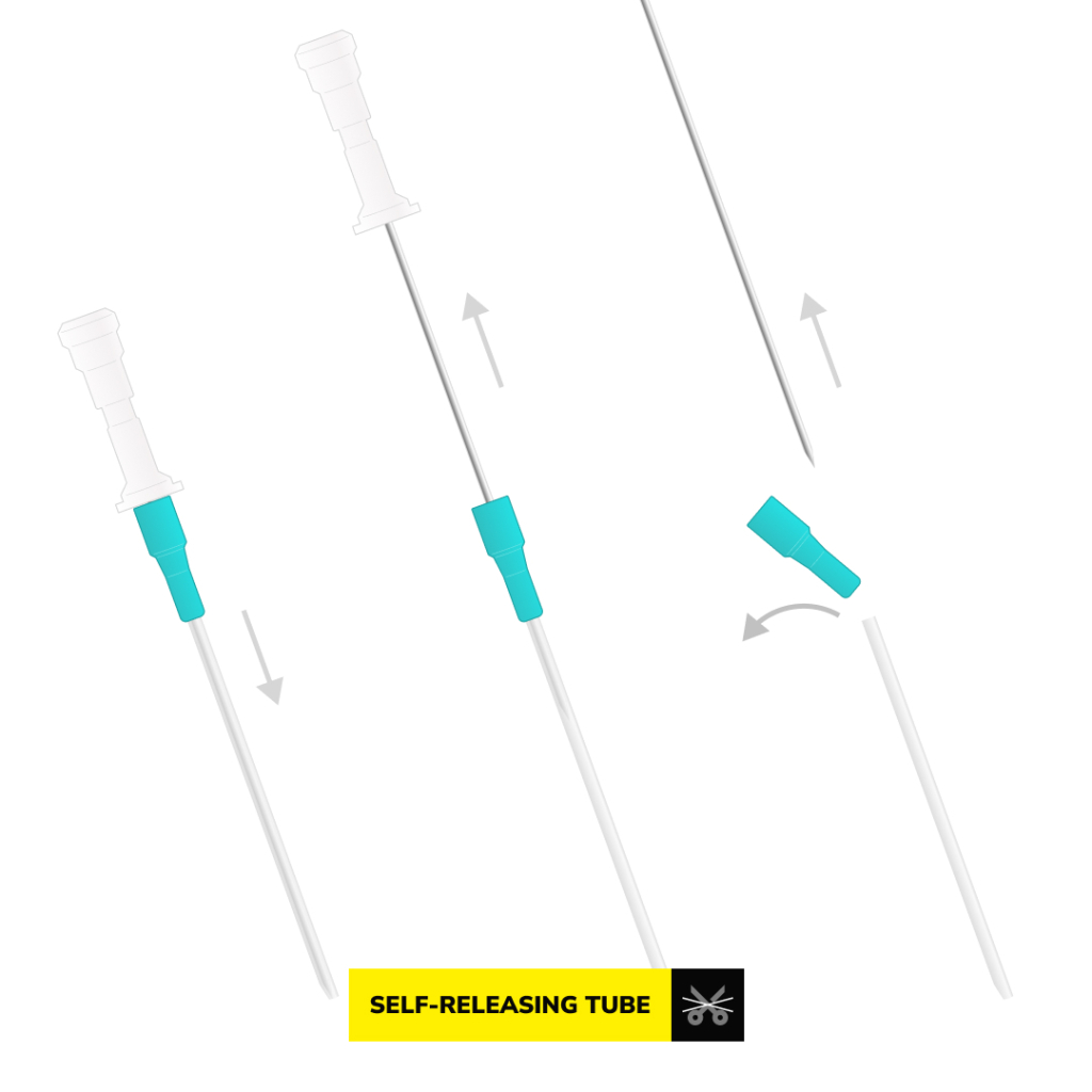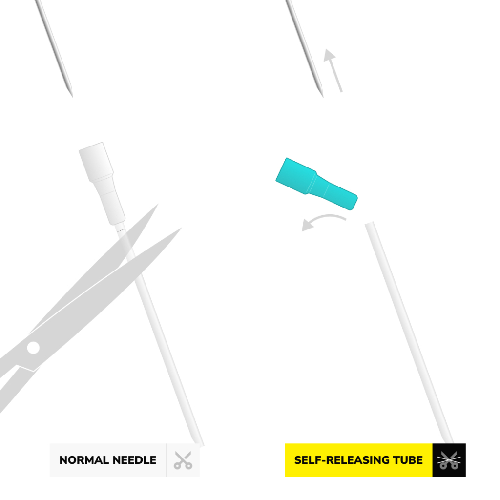 Mosquito naalden zijn erg scherp en met EO-gas gesteriliseerd. Er zitten 50 apart gesteriliseerde naalden in elke doos. Elke naald heeft zijn eigen katheter. Het ingenieuze aan dit model is dat je niet langer een schaar hoeft te gebruiken om de katheter te knippen. De naald beschikt over een zelflossende functie. Dit betekent dat het gekleurde deel van de katheter eraf valt wanneer je de naald wegtrekt na het piercen. Op deze manier blijft alleen de katheter in het lichaam, die dan het sieraad door het gaatje trekt.