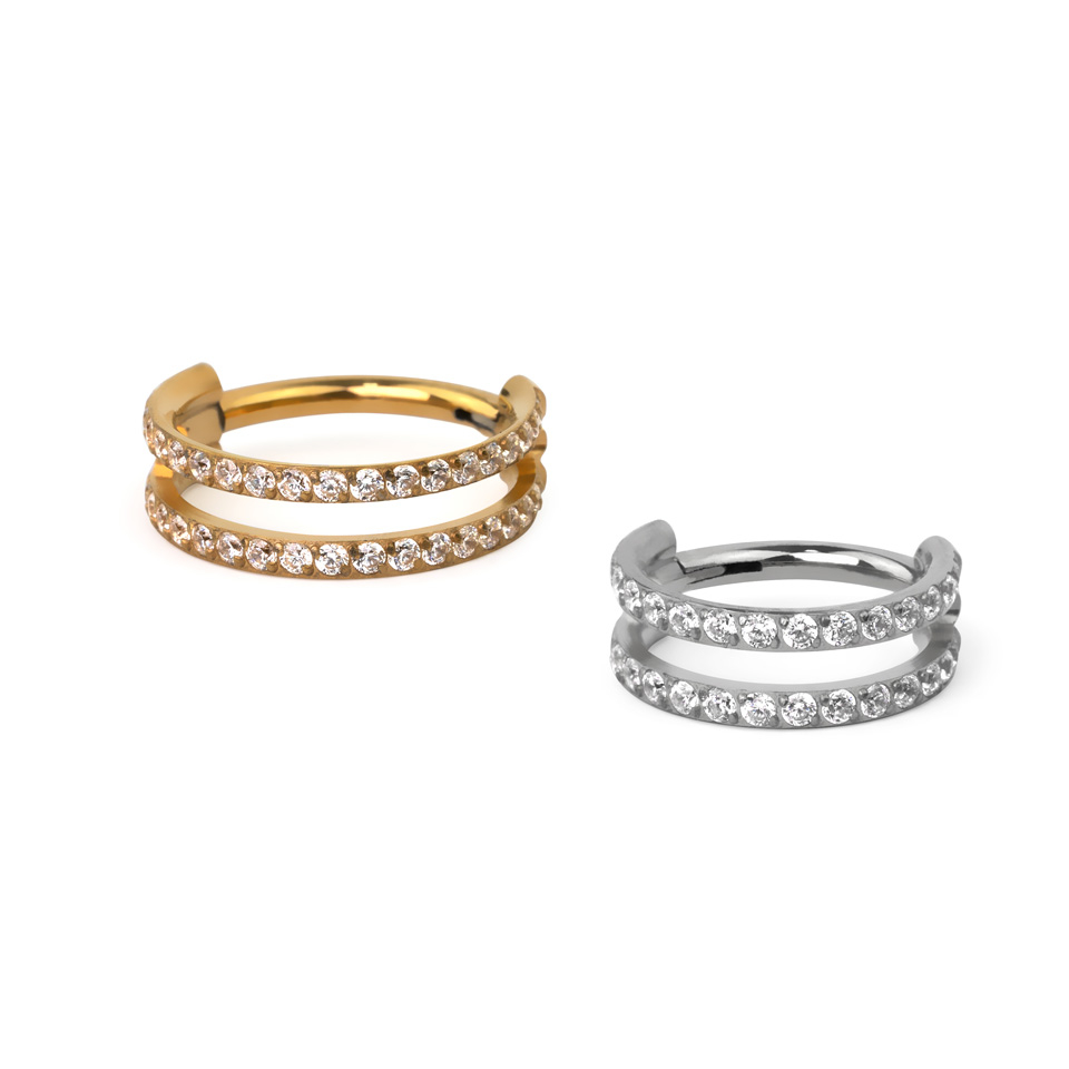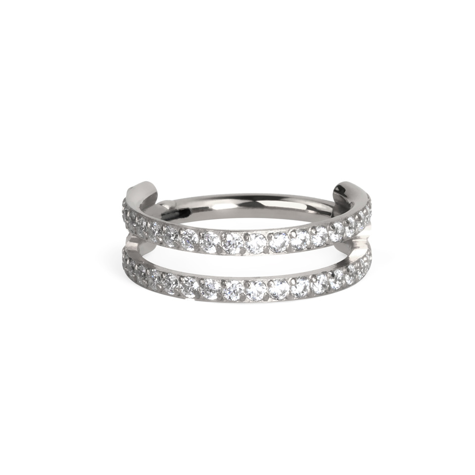 Deze fantastische dubbele ring heeft twee halve cirkels die zijn bekleed met steentjes van transparante zirkonia. Als je fan bent van glitter en de glamour dan is een dubbele ring alleen maar logisch.
