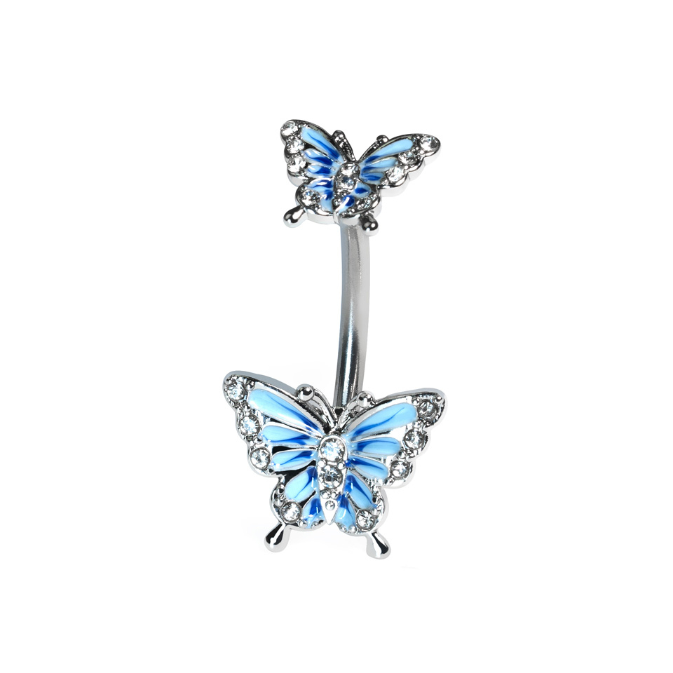 Deze navel barbell heeft niet één, maar twee schattige blauwe vlinders - een grote aan de onderkant en een kleintje bovenop. Allebei hebben ze kleine sprankelende steentjes op hun vleugels en lichaam.
