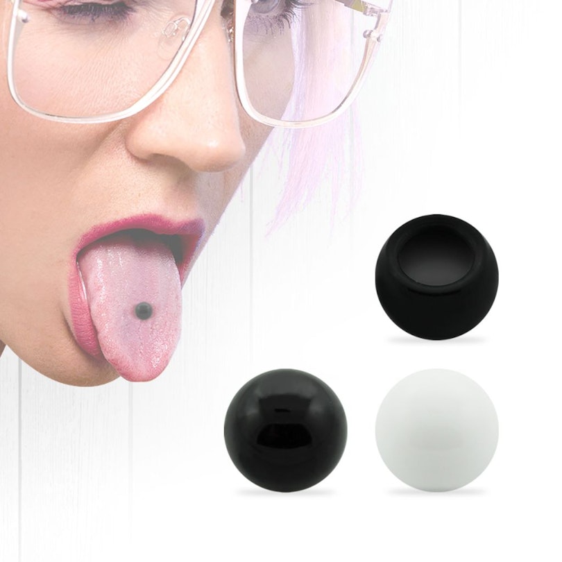 Op de afbeelding hierboven zie je een fake tongpiercing. Dat houdt in dat je geen gaatje in je tong nodig hebt om dit sieraad te kunnen gebruiken. Met deze tongpiercing kun je zowel zien als voelen hoe het is om een tongpiercing te hebben voordat je je eraan waagt om er een te laten zetten. Deze fake tongpiercing is verkrijgbaar in twee kleuren, namelijk zwart en wit. Het balletje is gemaakt van acryl, waarbij er aan een zijde een holte zit. Deze holte is er om een vacuüm te creëren, zodat het balletje vast blijft zitten op je tong wanneer je de lucht er uit zuigt en zo een onderdruk creëert.