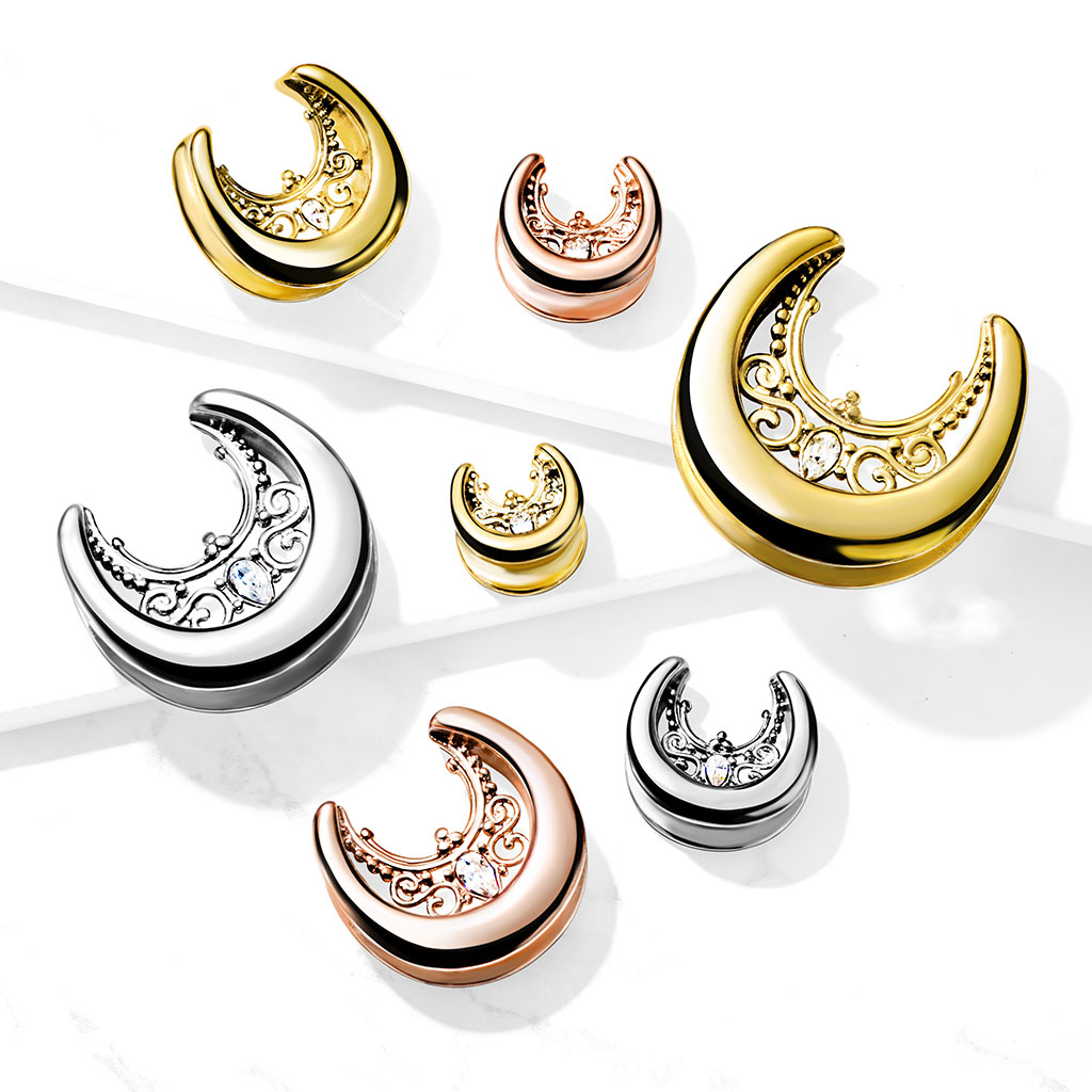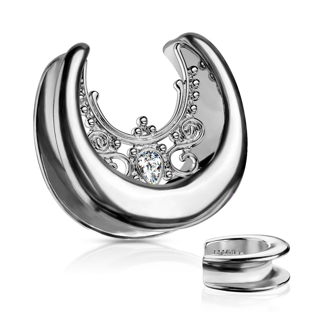 Deze Saddle Spreader zier er op het eerste gezicht heel eenvoudig uit, maar als je goed kijkt, zie je de filigraanversieringen. Kijk maar naar de mooie wendingen en de kleine ballen. Er zit geen bijzonder motief in het ontwerp, maar het ziet er in zn geheel uit als een strak geborduurd patroon. In het midden van het patroon is een kleine en heldere druppelvormige steen, dit geeft het ontwerp de finishing touch. De sieraden zijn verkrijgbaar in verschillende maten en kleuren. Je hebt echter een stretch van minstens 10mm in diameter nodig om dit sieraad te kunnen gebruiken, want dit is het kleinste formaat. Als je stretch iets groter is dan je bestelde maat, is dit geen probleem. De naar beneden gerichte rand zorgt voor een goede houvast.