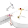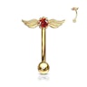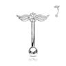 De staaf die je op de afbeelding is een gebogen staaf en is dan ook heel geschikt voor een wenkbrauw. De staaf is 8 mm lang en 1,2 mm dik. Aan de onderkant van de staaf zit een 3 mm balletje dat je op en af kunt schroeven. Aan de top van de staaf zit geen balletje zoals je ze normaal gesproken wel kent. In plaats daarvan zit er een paar engelenvleugels, welke uitgestrekt zijn. In het midden van de vleugels zit een mooie steen die verkrijgbaar is in verschillende kleuren. De staaf is gemaakt van chirurgisch staal, zoals de meeste andere piercing sieraden. De versieringen zijn van messing gemaakt. Het gehele sieraad heeft of een rhodium of een 14 karaats bladgouden coating. De vleugels meten ongeveer 10 mm van het midden tot het einde.