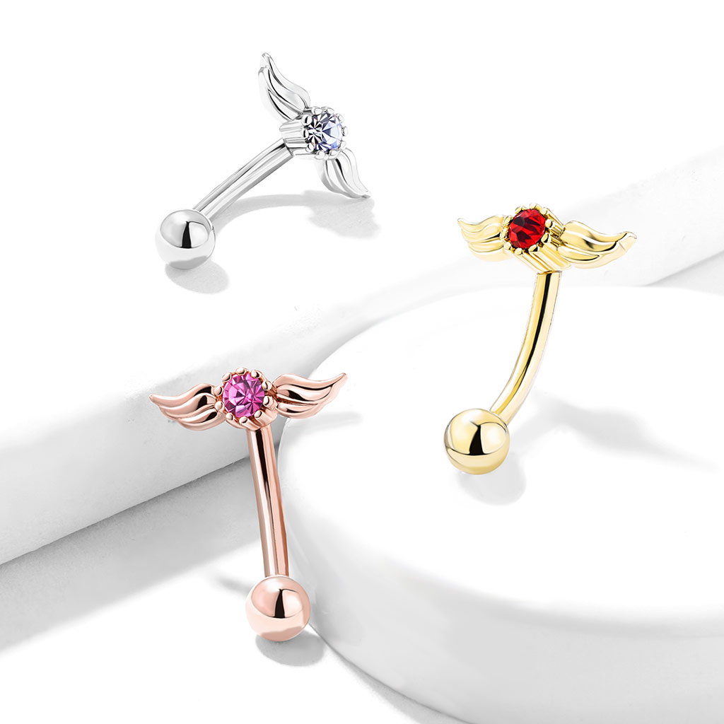 De staaf die je op de afbeelding is een gebogen staaf en is dan ook heel geschikt voor een wenkbrauw. De staaf is 8 mm lang en 1,2 mm dik. Aan de onderkant van de staaf zit een 3 mm balletje dat je op en af kunt schroeven. Aan de top van de staaf zit geen balletje zoals je ze normaal gesproken wel kent. In plaats daarvan zit er een paar engelenvleugels, welke uitgestrekt zijn. In het midden van de vleugels zit een mooie steen die verkrijgbaar is in verschillende kleuren. De staaf is gemaakt van chirurgisch staal, zoals de meeste andere piercing sieraden. De versieringen zijn van messing gemaakt. Het gehele sieraad heeft of een rhodium of een 14 karaats bladgouden coating. De vleugels meten ongeveer 10 mm van het midden tot het einde.