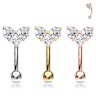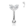 De staaf is licht gebogen en heeft een 3 mm sluitballetje aan de onderkant. Aan de bovenkant zijn drie kleine steentjes bevestigd met behulp van kleine armpjes van messing. De steentjes vormen samen een hartje. Twee steentjes zijn rond en de derde is vierkant. Met een beetje fantasie kan het ook op een vogel lijken met de twee ronde steentjes als ogen en de vierkante steen als bek. De staaf van het sieraad heeft een lengte van 8 mm tussen het hartje en het balletje. De staaf is 1,2 mm dik. Het is gemaakt van chirurgisch staal en is vervolgens gekleurd met ofwel rhodium of bladgoud. Rhodium geeft een zilverkleurig oppervlak en goud geeft vanzelfsprekend een goudkleurig oppervlak. Het maakt niet welke kleur je kiest, het sieraad heeft dezelfde maten en dezelfde kleur steen. Het is dus uitsluitend de kleur van het sieraad wat het verschil maakt.