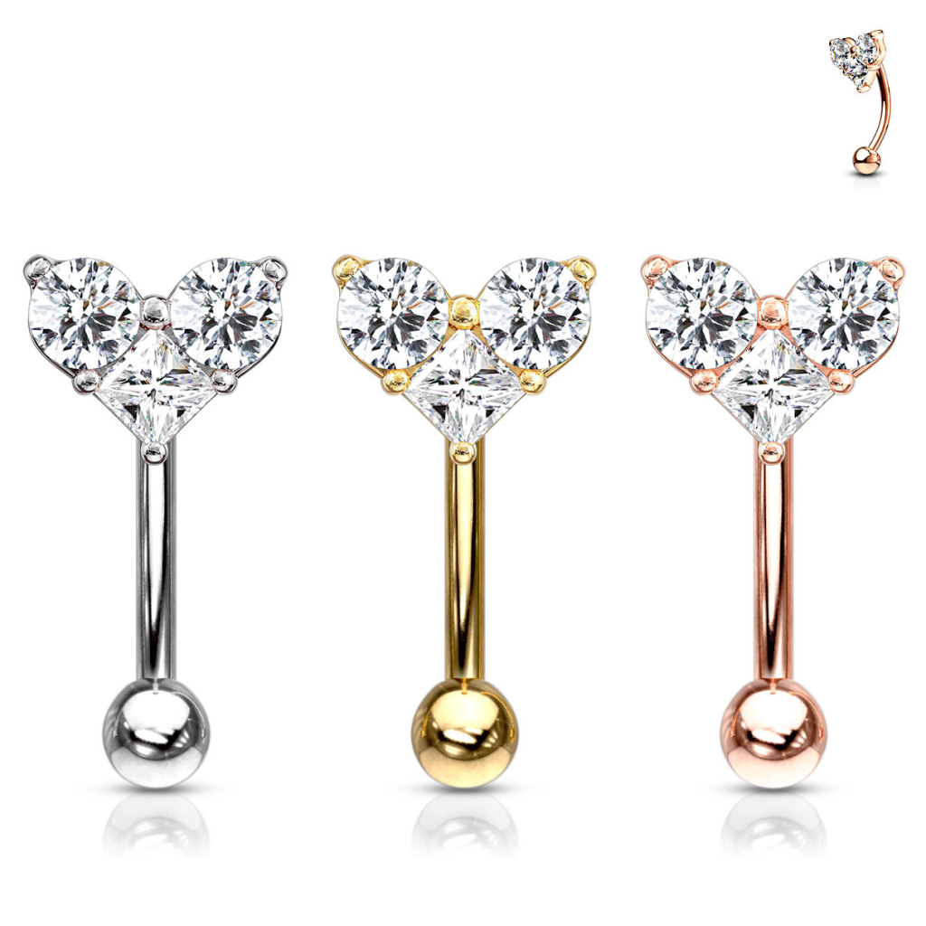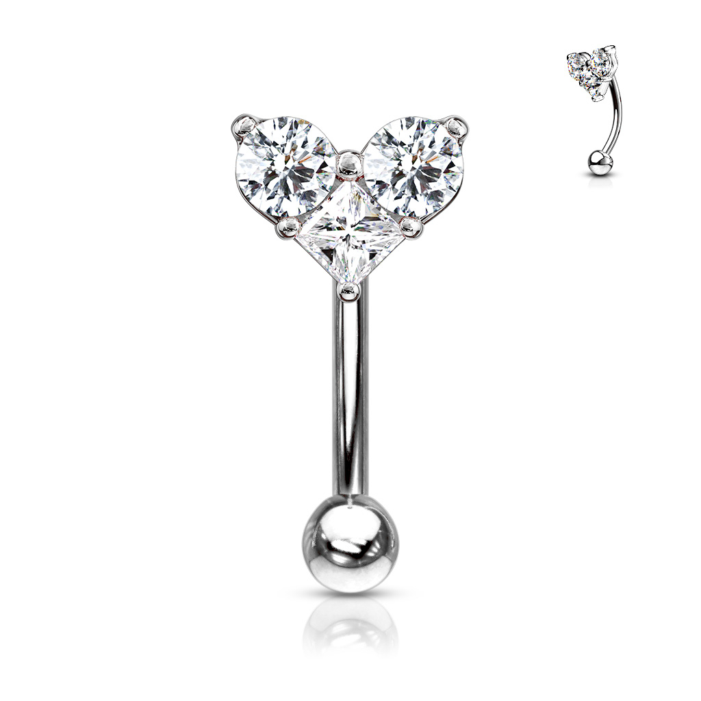 De staaf is licht gebogen en heeft een 3 mm sluitballetje aan de onderkant. Aan de bovenkant zijn drie kleine steentjes bevestigd met behulp van kleine armpjes van messing. De steentjes vormen samen een hartje. Twee steentjes zijn rond en de derde is vierkant. Met een beetje fantasie kan het ook op een vogel lijken met de twee ronde steentjes als ogen en de vierkante steen als bek. De staaf van het sieraad heeft een lengte van 8 mm tussen het hartje en het balletje. De staaf is 1,2 mm dik. Het is gemaakt van chirurgisch staal en is vervolgens gekleurd met ofwel rhodium of bladgoud. Rhodium geeft een zilverkleurig oppervlak en goud geeft vanzelfsprekend een goudkleurig oppervlak. Het maakt niet welke kleur je kiest, het sieraad heeft dezelfde maten en dezelfde kleur steen. Het is dus uitsluitend de kleur van het sieraad wat het verschil maakt.