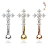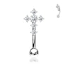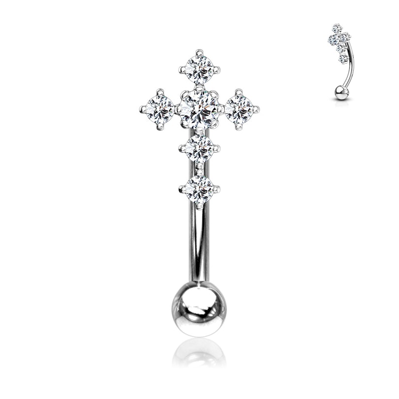 Deze gebogen staaf is gemaakt van chirurgisch staal en is verkrijgbaar in drie mooie kleuren. De kleuren die zijn gebruikt zijn van rodium voor het zilverkleurige model en 14 karaats goud voor de twee anderen. Het is slechts de kleur dat het verschil maakt tussen de varianten - zowel de maat als de kleur van de steentjes zijn verder identiek. De steentjes op het sieraad vormen samen een kruis. Er zit een steen aan de bovenkant, een aan iedere zijde, twee aan de onderkant en tot slot een wat grotere steen in het midden. Alle steentjes zijn rond en zitten vast met behulp van kleine vangarmpjes.