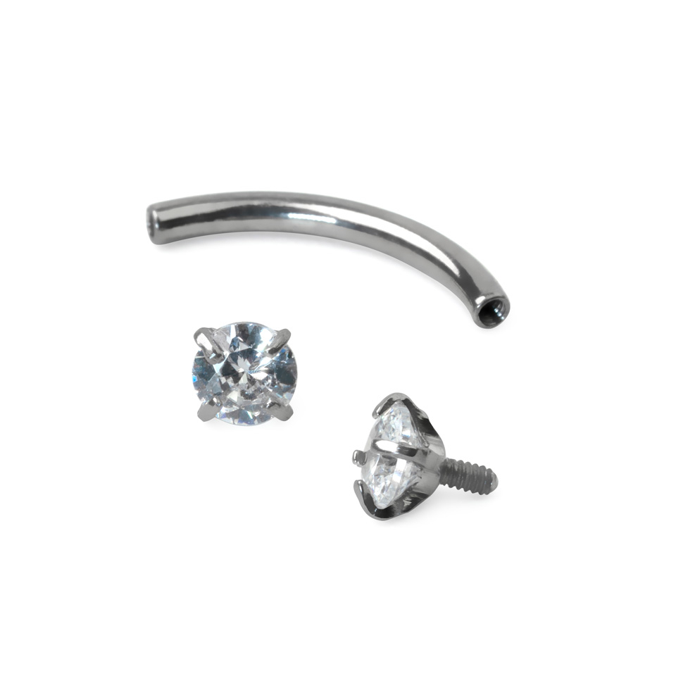 Naam: Gebogen staaf uit titanium met interne draad en steentjes