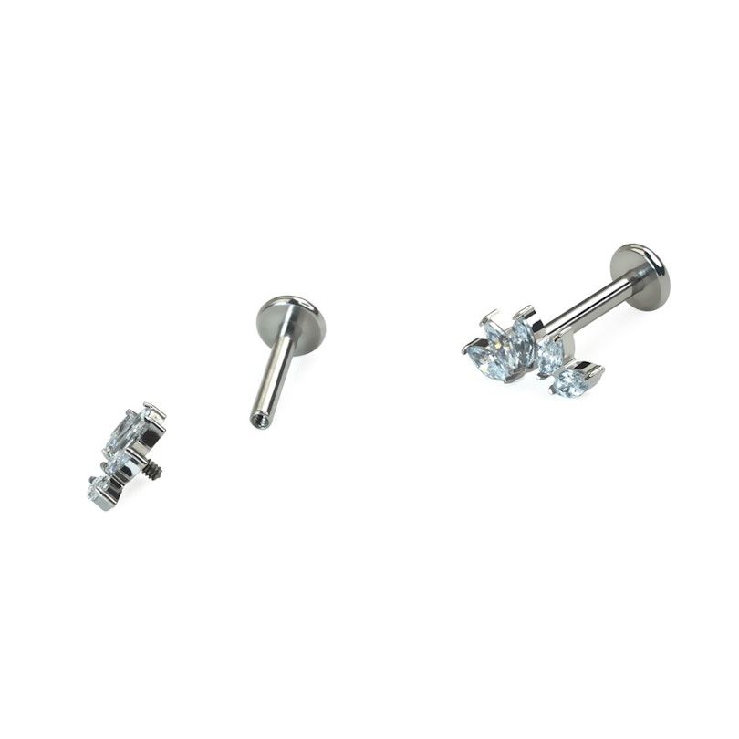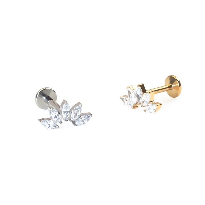 Deze titanium labret heeft 5 marquise snit CZ stenen, geplaatst in een boogje. Dit sieraad heeft een intern schroefdraad, wat betekent dat je simpelweg het gladde staafje door je piercing doet en de bovenkant erop schroeft. Het is gemaakt van titanium, dus het is comfortabel om te dragen, zelfs voor de gevoelige huid. Geschikt voor verschillende oor piercings, zal het sieraad er perfect uitzien in je helix of flat piercing.