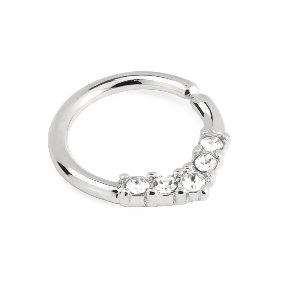 Dit is een fantastische gesloten ring. Het sieraad is klassiek en rond, maar eindigt met een kleine bezaaide V-vorm aan de onderkant. Als je van opvallende sieraden houdt, dan is deze voor jou!