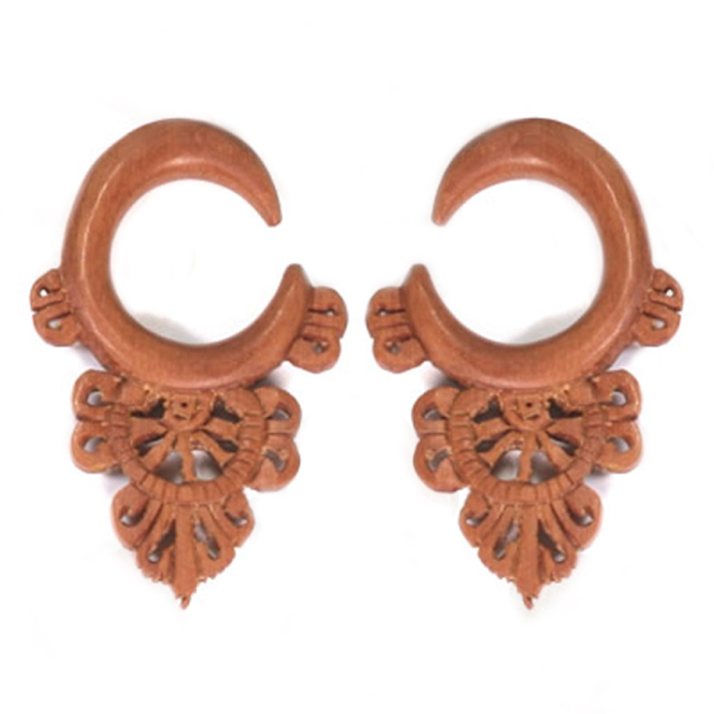 Dit sieraad van hout is een zogenoemde ''hanger'' voor het stretchen. Voor deze hanger is het Saba-hout gebruikt, wat een rood-bruine kleur heeft. Het voordeel van dit houtsoort is dat de takstructuur niet zo duidelijk te zien is zoals dat bij andere houtsoorten wel is. Dat leent zich bijzonder goed voor de productie van sieraden, omdat het eenvoudiger is om identieke sieraadstukken te snijden.