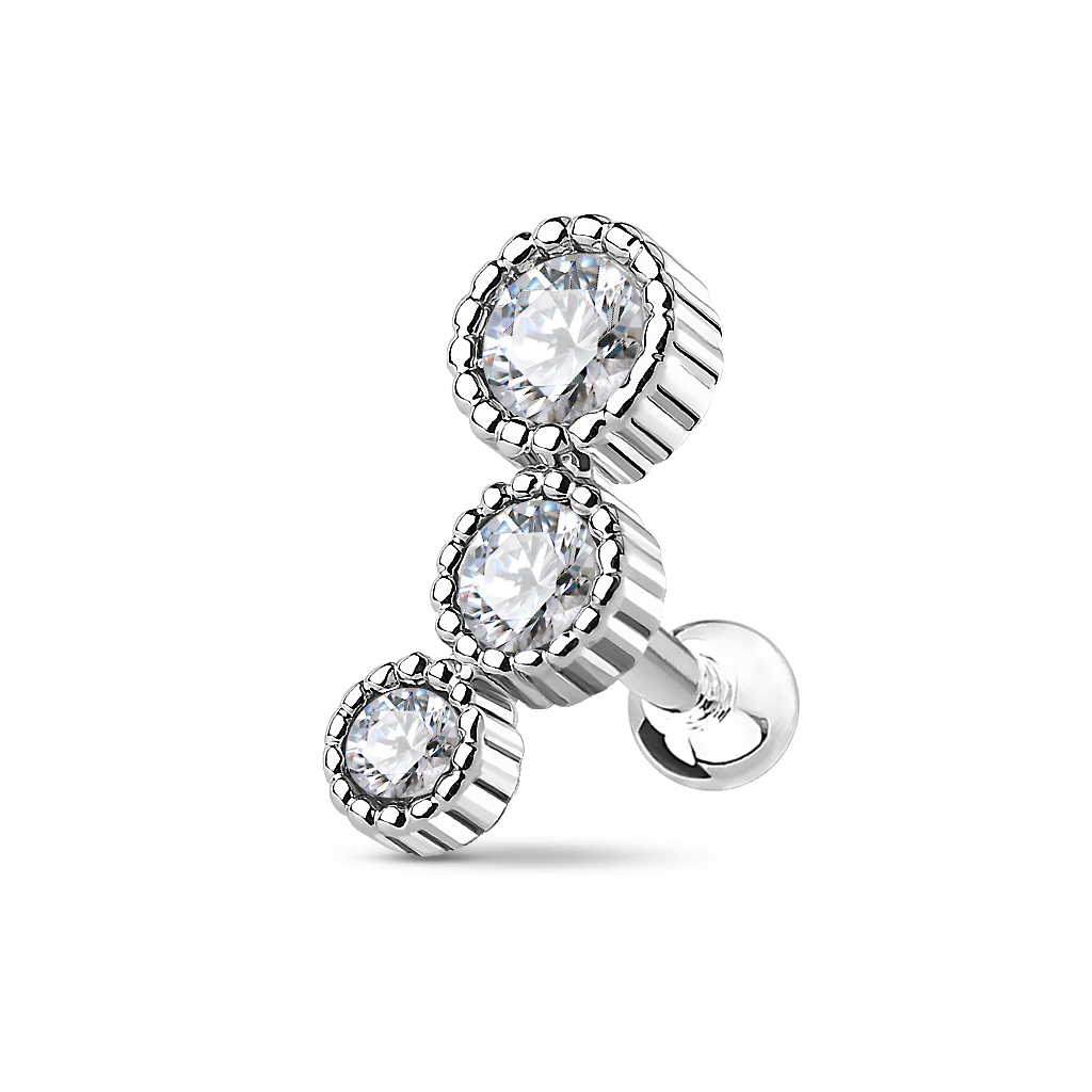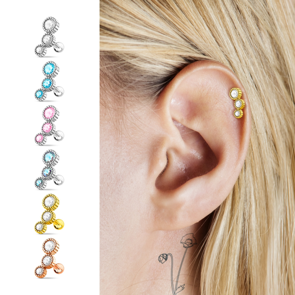 Helixpiercing met 3 ronde stenen in verschillende groottes