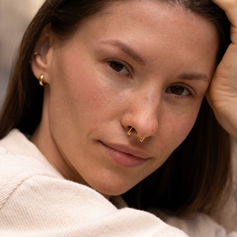 Dit titanium hoefijzer heeft geen schroefdraad, wat betekent dat de balletjes kleine pinnetjes hebben die je in het hoefijzer drukt om vast te zetten in je piercing. De balletjes hebben meerdere facetten waardoor ze een coole textuur hebben en je doen denken aan mini disco balletjes. Dit sieraad is geschikt voor verschillende piercings, waaronder wenkbrauw-, oor- en septumpiercings, en is verkrijgbaar in goud en zilver.