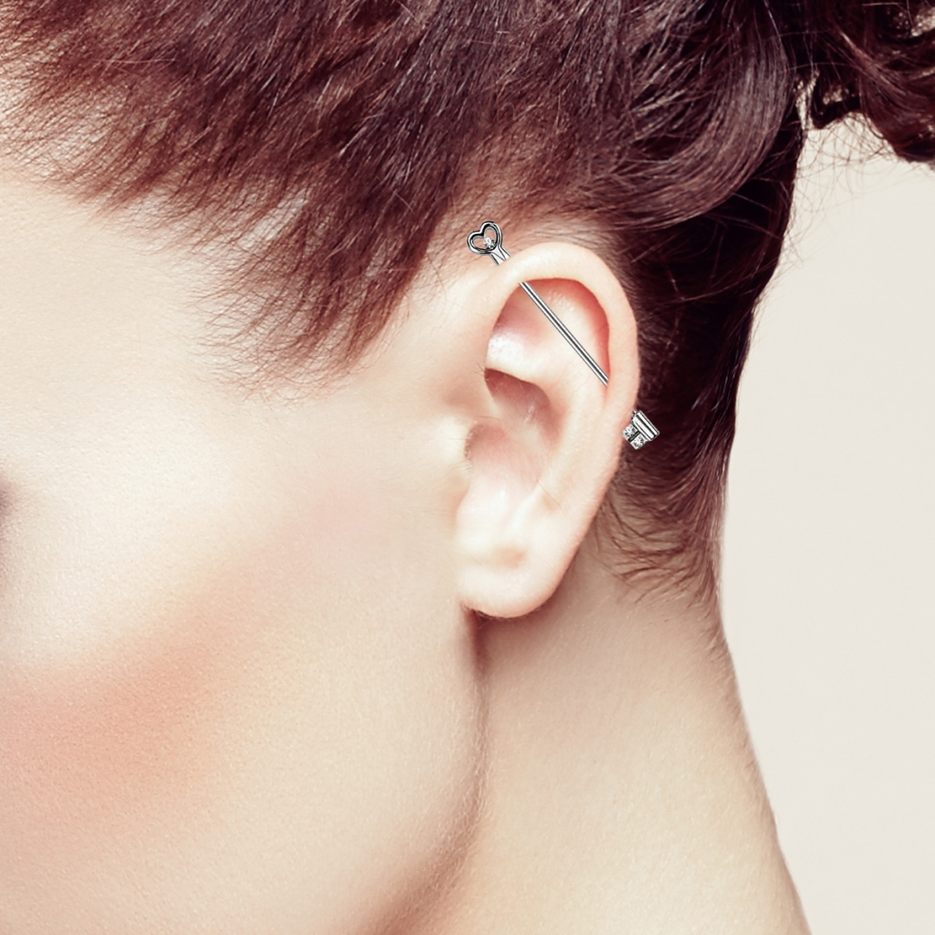 Dit mooie sieraad is vervaardigd uit het robuuste chirurgische staal, wat vanwege de stabiliteit een de mooie glans een zeer gebruikelijk materiaal is voor piercingssieraden. Om deze industrial in te doen, hoef je alleen beide balletjes aan de uiteinden van de staaf af te schroeven (dus de handgreep en het onderste deel van de sleutel), en het staafje in je oor te schuiven. Daarna schroef je de beide uiteinden gewoon weer op het staafje, waarna het sieraad prachtig op z'n plek zit in je oor.
