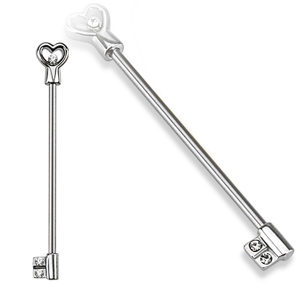 Slanke, glanzende en elegante industrial staaf voor in je oor. Het design is echt onwijs schattig en vrouwelijk, aangezien de industrial staaf gevormd is als een sleutel met een handgreep in de vorm van een hart. Aan deze greep zit een kleine, vonkelende steen, en in het sleutelvormige deel bevinden zicht ook twee mooie stenen in dezelfde kleur. Je kunt kiezen tussen transparant, roze of turquoise, geheel naar je eigen smaak.