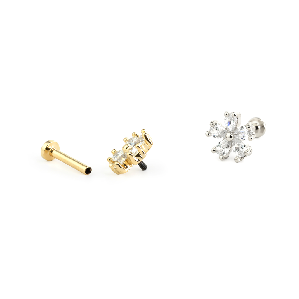 De bloem bestaat uit messing, maar is gecoat zodat de kleur matcht met de rest van het sieraad. Het sieraad is verkrijgbaar in verschillende kleuren, en de bloem is dan gecoat in kleur die je kiest. Als je bijvoorbeeld voor een roodgouden labret kiest, is de bloem dezelfde kleur. De stenen zijn echter altijd transparant.
