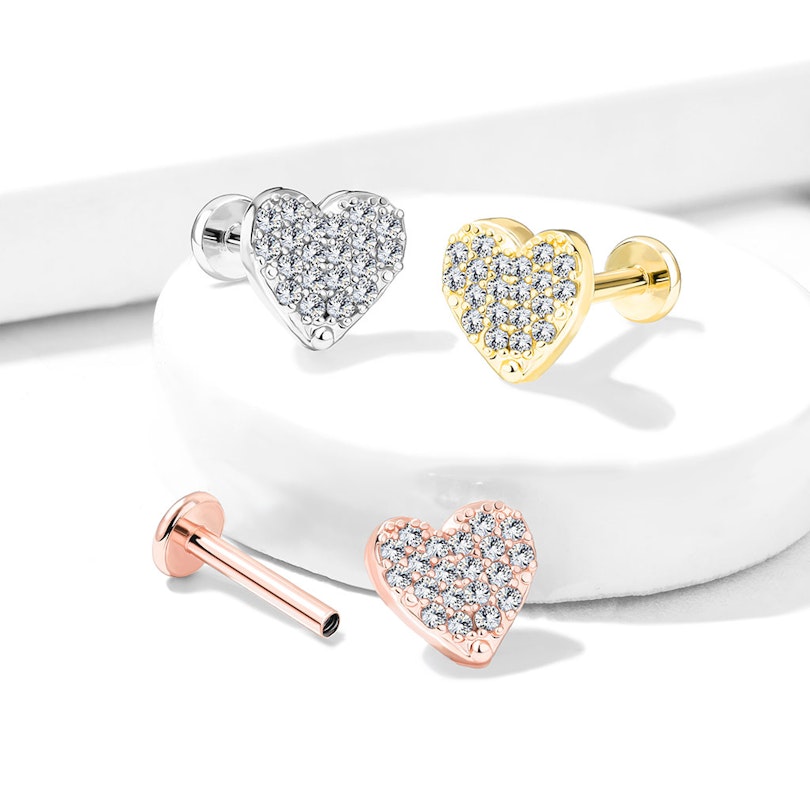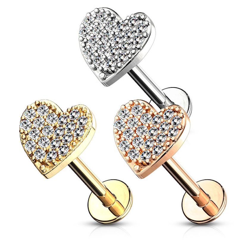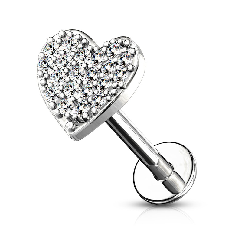 Hartjes op piercings zijn ongelooflijk populair. Deze lieve labret waar je op hebt geklikt heeft ook een hartje, maar met een twist: het hartje is bezet met kleine steentjes waardoor het glinstert en fonkelt.