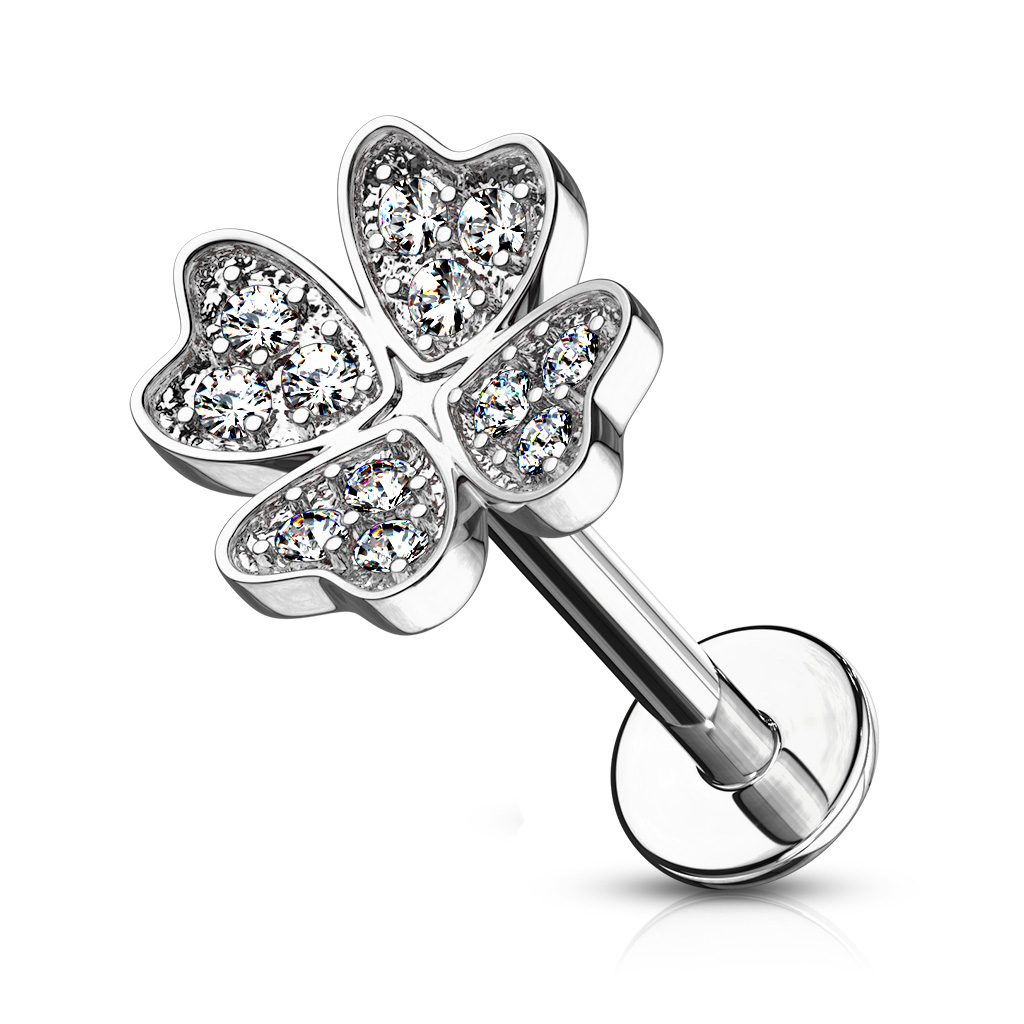 Het sieraad heeft een interne schroefdraad, dus de achterkant van het ontwerp kan je het makkelijk en pijnloos in het staafje schroeven. De labret is gemaakt van chirurgisch staal dat gecoat is in dezelfde kleur als het klavertjevier. Daardoor heb je de mogelijkheid om uit meerdere kleuren te kiezen. Je kan ook uit verschillende lengtes de maat kiezen die het beste bij je piercing past.