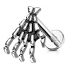 Een labret wordt gekenmerkt door een rechte staaf met een vaste plaat aan de onderkant. Dit is ook bij dit sieraad het geval. Maar bovenaan zit geen normaal balletje waarmee een labret meestal wordt uitgerust. Hier wordt de bal vervangen door een hand - Een skelethand.