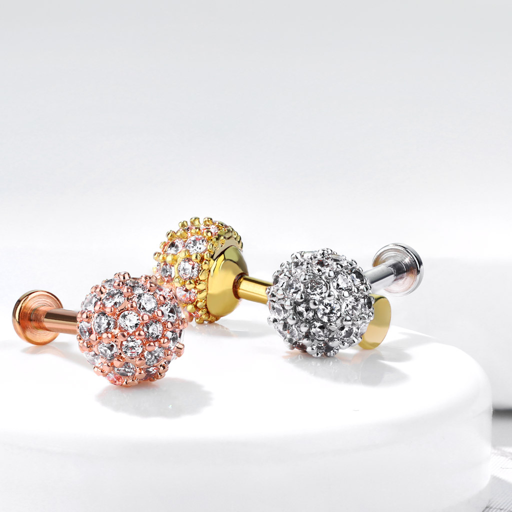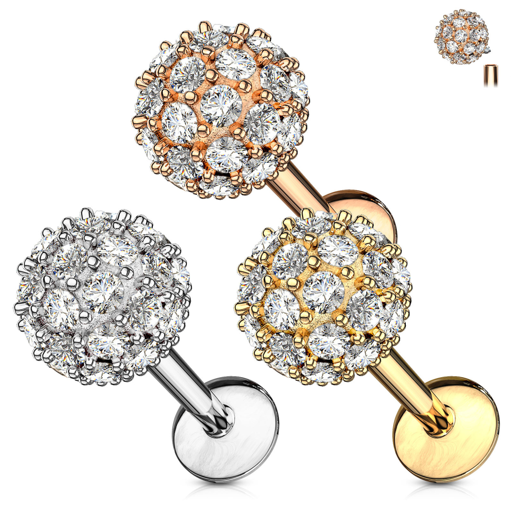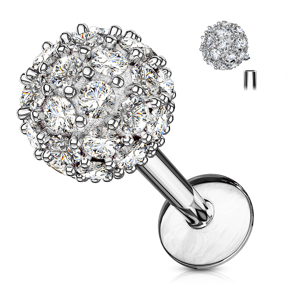 Dit sieraad is versierd met een grote bal die 6 mm in diameter meet. Verspreid over de bal bevinden zich fonkelende steentjes die schitteren wanneer het licht erop valt: deze labret is dus een echte eye-catcher.
