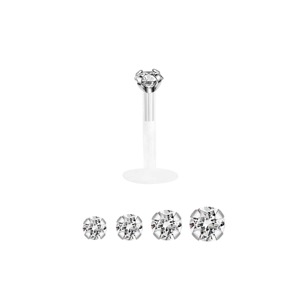 De top van de labret is gemaakt van het exclusieve materiaal 14 karaats goud. Het sieraad is verkrijgbaar in drie verschillende goudtypen, namelijk witgoud, roodgoud en goud. Alle varianten hebben een kleine transparante facetgeslepen steen. Deze steen wordt gebruikt als vervanging voor een diamant, aangezien het op de zelfde manier het licht reflecteert met de kleine facetten. Het licht wordt weerkaatst en dat geeft een heel mooi glinsterend effect waardoor de piercing echt opvalt. De grootte van het steentje kun je zelf kiezen, afhankelijk van hoe veel het sieraad moet opvallen.
