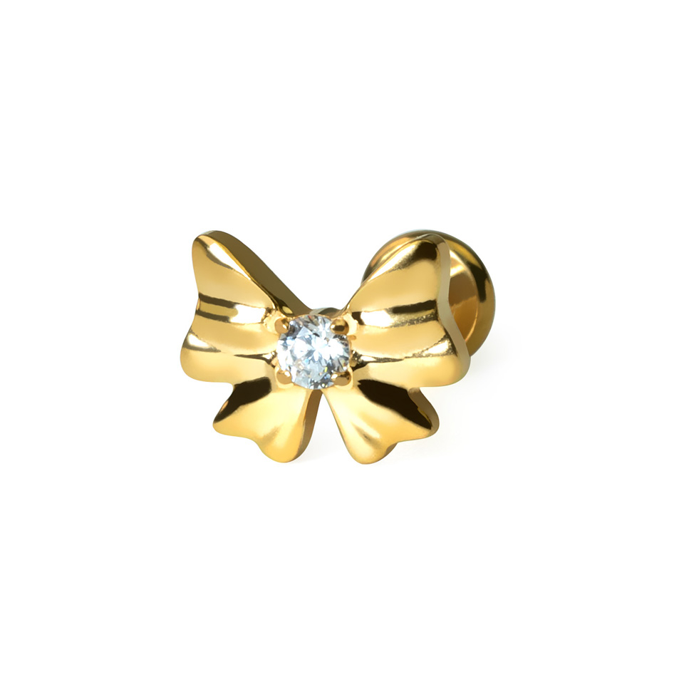 Deze lieve labret heeft een schattig strikje met een centrale CZ steen. Het strikje is 8 mm op het meest wijde punt, en de steen 2 mm.