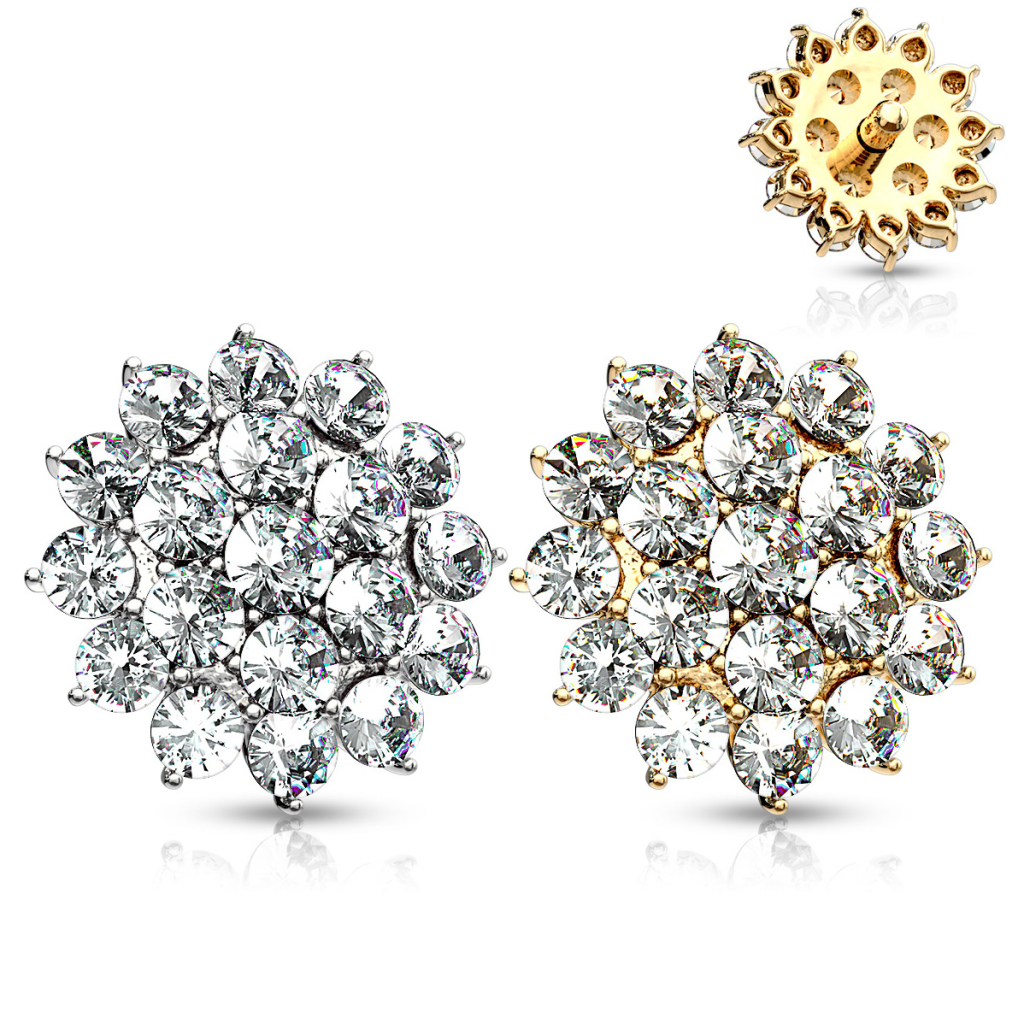 Hier heb je een sieraad dat zeker en vast geschikt is om je dermal basisplaat mee te versieren. Dit sieraad heeft de vorm van een bloem en is zo goed als helemaal bezet met steentjes die het een buitengewone glans verlenen. De steentje zitten via metalen haakjes goed op hun plek vast.