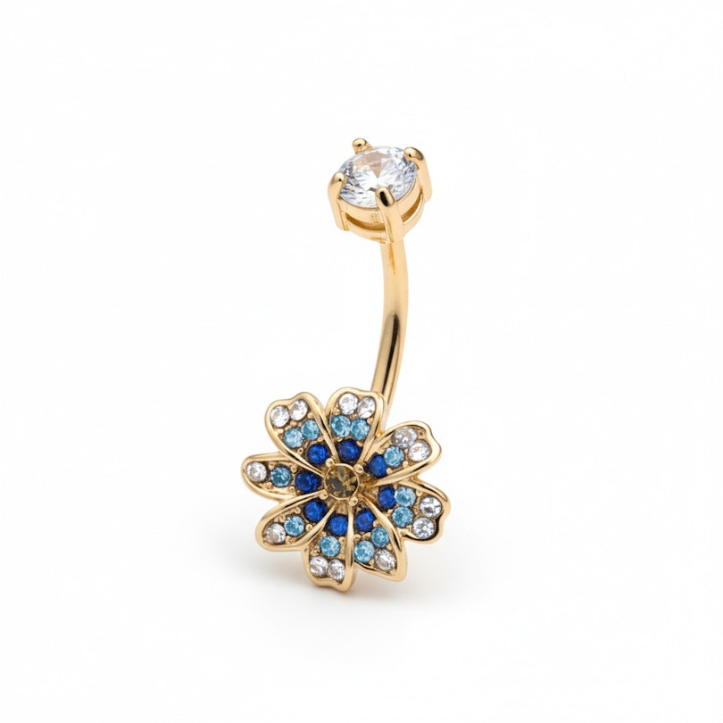 Deze schattige navel barbell is gemaakt voor crop top seizoen. Het sieraad heeft een bloem gemaakt van kleine blauwe steentjes met een centrale gele steen. De bovenste bal heeft een doorzichtige steen.