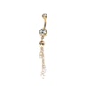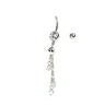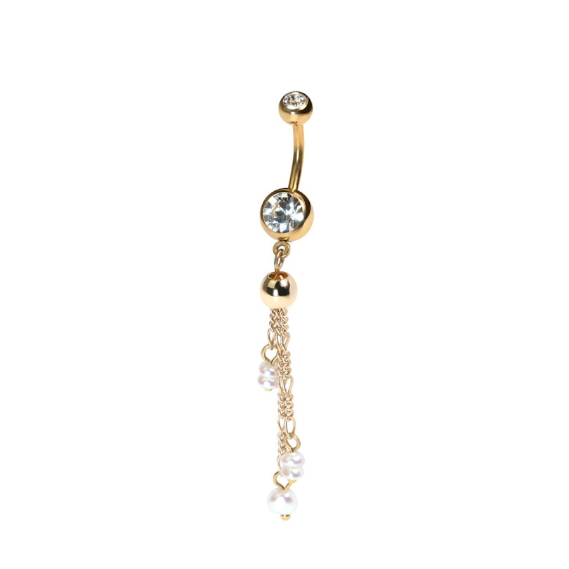 Deze navel barbell met kettinkjes en parels heeft een bezel gezette zirconia steen in beide balletjes, en aan de onderste bal hangen elegante kettinkjes met verschillende maten synthetische parels.