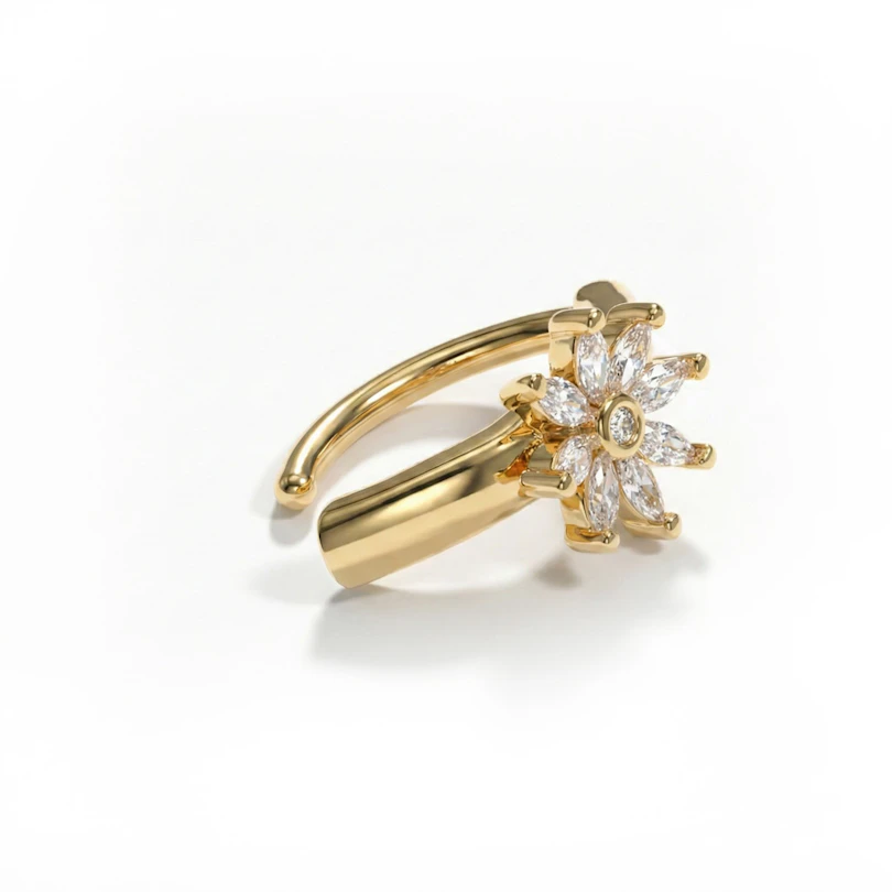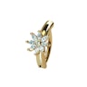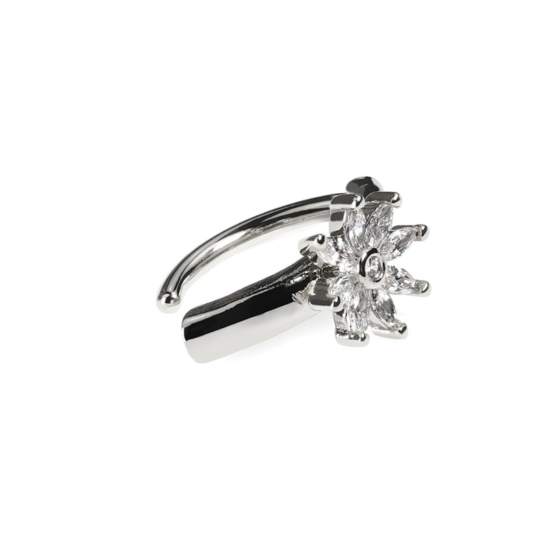 Deze stijlvolle navel clicker heeft een glitterende bloem in het midden. De bloem is gemaakt van 9 zirkonia steentjes. Het sieraad is beschikbaar in een gouden of zilveren afwerking.