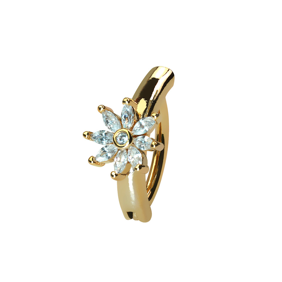 Deze stijlvolle navel clicker heeft een glitterende bloem in het midden. De bloem is gemaakt van 9 zirkonia steentjes. Het sieraad is beschikbaar in een gouden of zilveren afwerking.