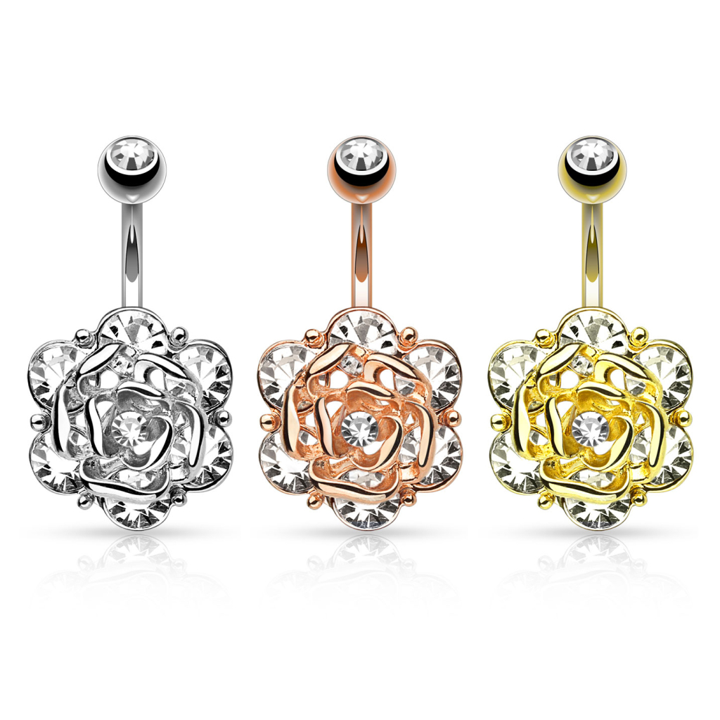 Navelpiercing in verschillende kleuren met een bloem uit steentjes