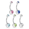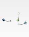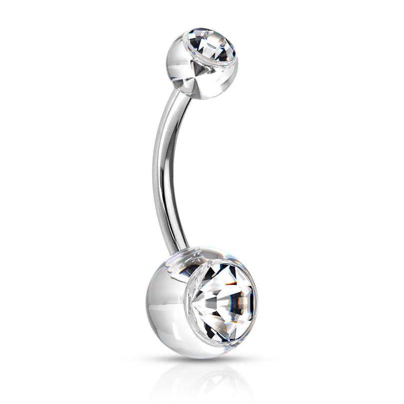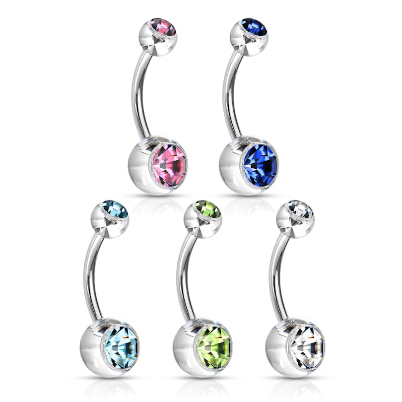 Hier hebben we een werkelijk prachtig "alledaags-sieraad", wat niet alleen heel mooi is, maar daarnaast ook bijzonder stijlvol rn sober ontwerp heeft. De navelpiercing heeft een staafje uit chirurgisch staal en twee sluitballetjes. Beide balletjes zijn met een mooie steen versierd, waarvan je de kleur zelf kan uitkiezen. We hebben vijf kleuren voor je, variërend van eerder klassiek tot fel en opvallend.