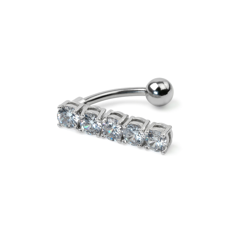 Dit sieraad heeft geen top balletje, maar daarentegen een mooie hanger, die boven aan het top balletje hangt. Het hangertje bestaat uit 5 transparante steentjes, die allemaal vast zitten met behulp van 4 kleine vangarmpjes. Alle steentjes zitten in hun eigen compartiment, met de bovenste steen vast gemonteerd aan het staafje. De steentjes hangen op een rijtje en zijn samen niet langer dan het onderste balletje.
