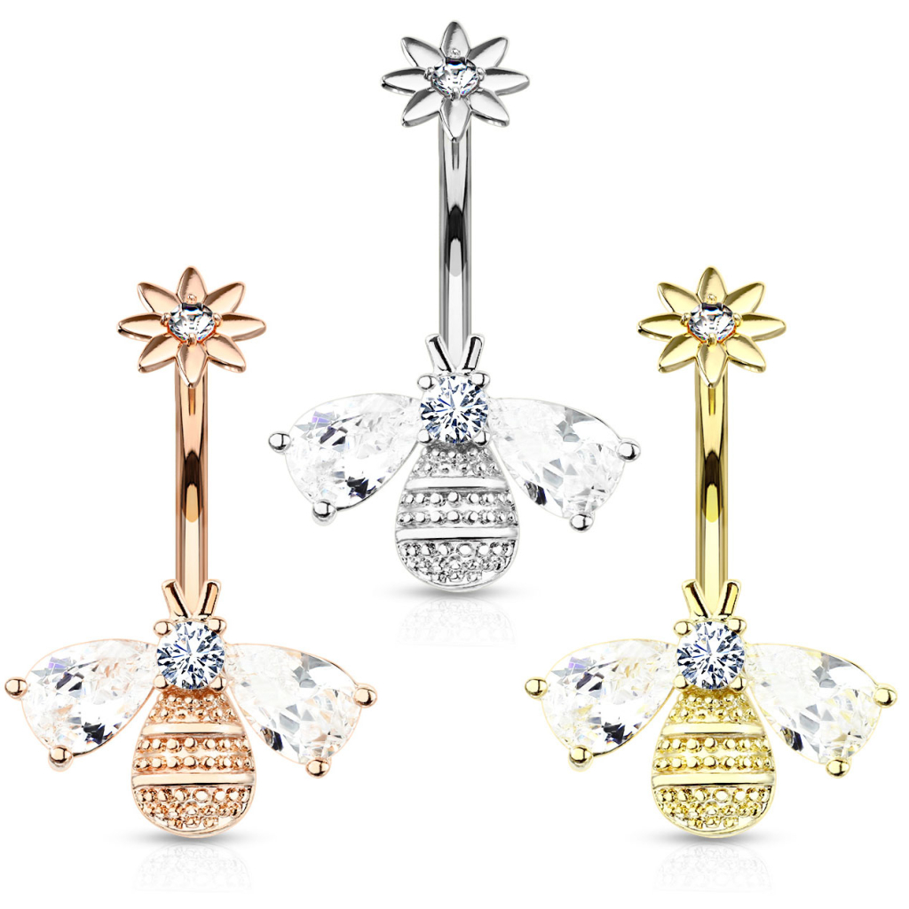 Een navelpiercing hoeft niet altijd te bestaan uit een normale ronde topbal en een iets grotere onderste bal. Je kunt, zoals in dit geval, een beetje creatiever zijn en iets extra's maken van het ontwerp. De bovenkant heeft niet alleen een binnendraad, hij is ook uitgerust met een bloemvormige sluitbal met een kleine steen in het midden. De bloem wordt losgeschroefd van de 10 mm lange staaf, waar aan het einde een kleine bij zit met prachtige vleugels met steentjes. Er zitten ook mooie details op het lichaam om de algehele look meer levensecht te maken. Je kunt dit model in drie verschillende kleuren kiezen. Verder is alles identiek, alleen de kleur van het metaal is het verschil. Nu we het over het metaal hebben, moeten we vermelden dat de staaf is gemaakt van chirurgisch staal. Alleen de bij is gemaakt van messing.