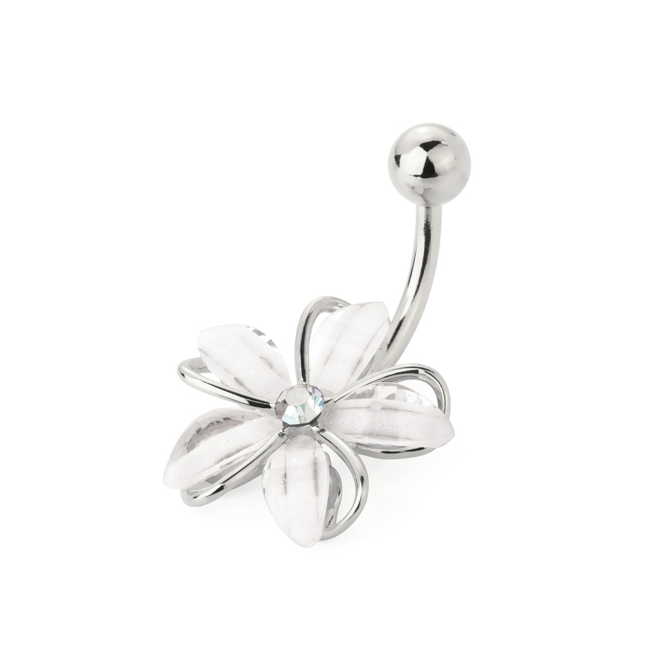 Ben je op zoek naar een chique piercing? Deze navelring heeft een gedetailleerd bloemmotief aan de onderkant en een eenvoudig sluitbolletje aan de bovenkant. Kies de kleur die het best bij jouw style past.