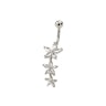 De staaf zelf is gemaakt van chirurgisch staal en is 10 mm lang en 1.6 mm dik - Precies zoals de standaard voor navelpiercings. De bovenste bal is 5 mm breed en heeft een heldere steen die overeenkomt met de stenen in de bloemen aan de hanger. Het metaal waarin de bloemen zijn bevestigd, is gemaakt van messing en vervolgens bedekt met rhodium of bladgoud, afhankelijk van de kleur die je kiest.