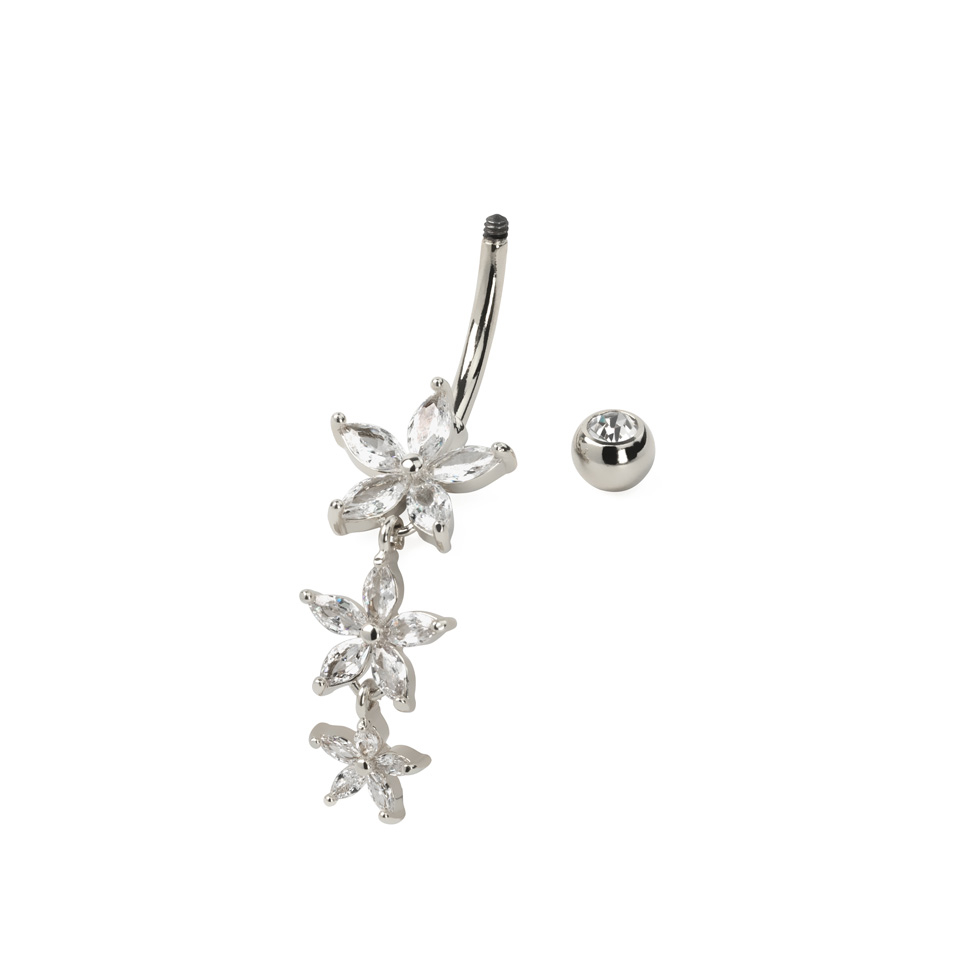 De staaf zelf is gemaakt van chirurgisch staal en is 10 mm lang en 1.6 mm dik - Precies zoals de standaard voor navelpiercings. De bovenste bal is 5 mm breed en heeft een heldere steen die overeenkomt met de stenen in de bloemen aan de hanger. Het metaal waarin de bloemen zijn bevestigd, is gemaakt van messing en vervolgens bedekt met rhodium of bladgoud, afhankelijk van de kleur die je kiest.
