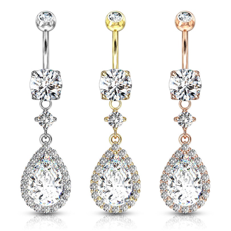 De navelpiercing die je hier ziet, is uitgerust met een grote druppelvormige steen in de hanger. De steen heeft ook nog kleine heldere steentjes als een sprankelende rand rondom de hanger. Boven de druppel zit nog een kleinere steen die tegelijkertijd fungeert als een schakel tussen de onderste bal en de druppel. Het geheel is bevestigd aan een staafje van chirurgisch staal. Het staafje is 10 mm lang en 1.6 mm dik. Dit zijn de standaardmaten voor een navelpiercing. Je kunt de piercing in drie kleuren kiezen. Er zijn twee goudkleurige modellen bedekt met bladgoud. Het zilverkleurige model is gerhodineerd. Behalve de kleur blijven alle modellen identiek.