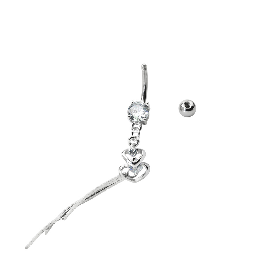 De drie stenen in deze navelpiercing hebben allen verschillende lengtes en de drie mooie kettingen geven het sieraad een extra elegante touch. Samen met de stenen en de kettingen geven ook de beide hartjes een spel van schoonheid en een zo eigenzinnige navelpiercing.