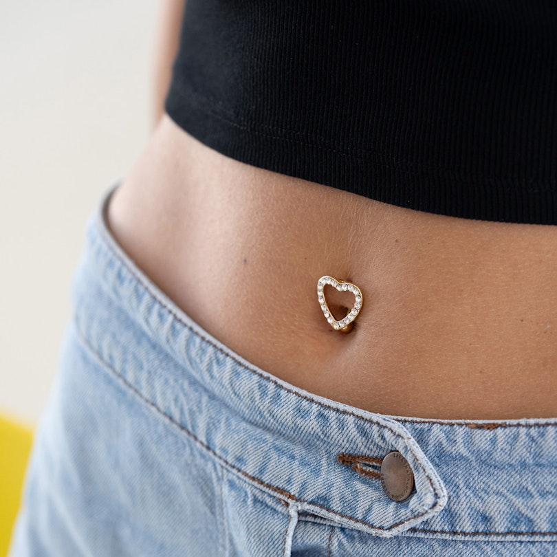 Navelpiercing met een groot hart met rand uit steentjes