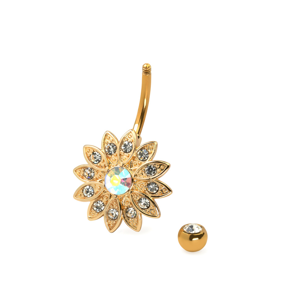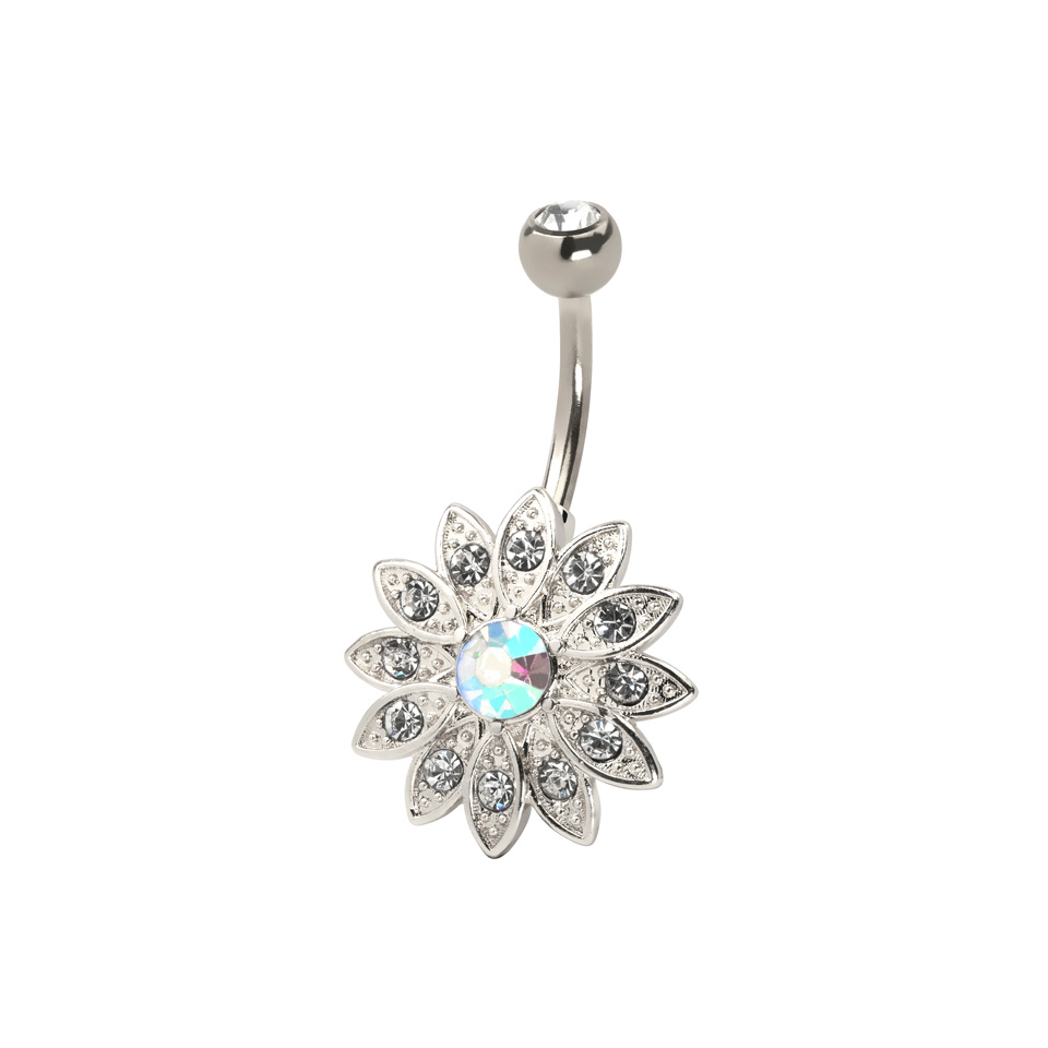 Het bloemetje bestaat in totaal uit 12 bloemblaadjes, die allemaal versierd zijn met een mooie, stralende transparante steen. De vele steentjes glinsteren en vonkelen als het sieraad beweegt, en het licht wordt opgevangen en gereflecteerd door de vele steentjes. Dat ziet er fantastisch uit als je navelpiercing in hebt, want het sieraad zal ook meebewegen. De vele bloemblaadjes zitten in twee laagjes, zodat de bloem er uit ziet als of het volledig tot bloei komt.