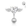 Hier ontvang je het mooie motief, welke al uit de tattoo branche bekend is, in een navelpiercing. Het is het bekende kleine hartje met vleugeltjes aan de zijkanten. Het sieraad is gemaakt uit chirurgisch staal, wat een van de meest geliefde materialen in de piercingbranche is, aangezien het geen nikkel vrij geeft. Het hartje bestaat uit een mooie facetgeslepen steen, die verkrijgbaar is in drie verschillende kleuren.