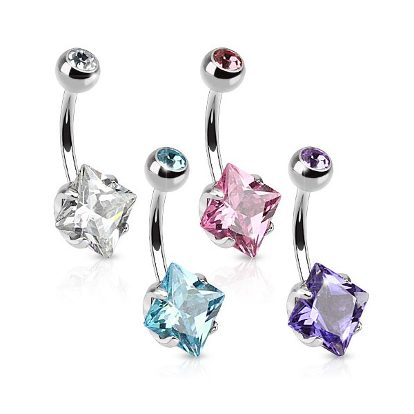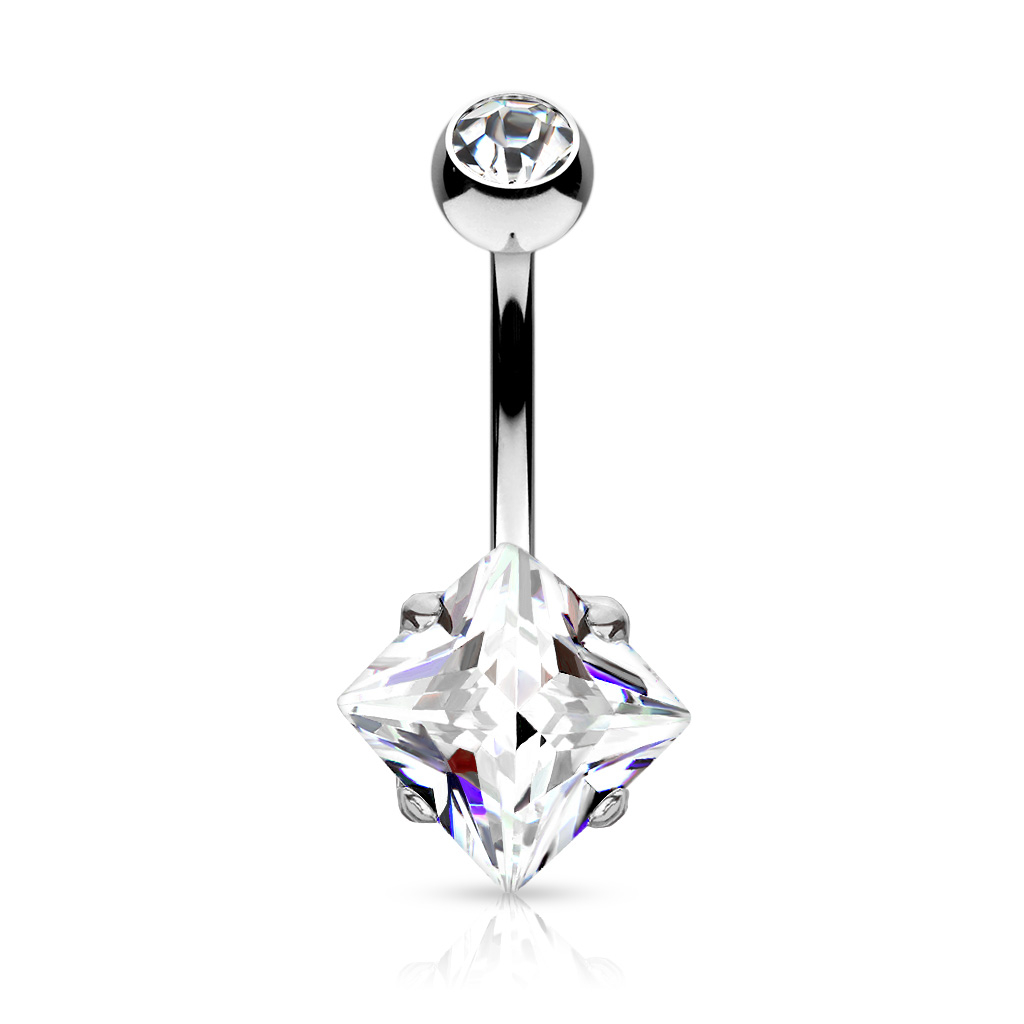 Als je gepassioneerd bent door navelpiercings die zich onderscheiden van normale navelpiercings, dan is dit fascinerende model zeker wat voor jou. Ondanks dat het ontwerp redelijk eenvoudig is, heeft deze navelpiercing een indrukwekkende edelsteen in de vorm van een vierkant als onderste balletje.