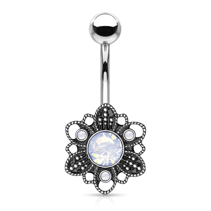 Naam: Navelpiercing met geoxideerde bloem met steen uit opaliet